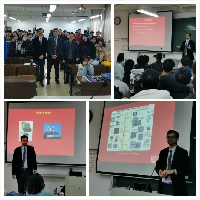 11日上午,贝尔法斯特女王大学电子电气与计算机科学公司的Wasif副教授和Hamza博士应永利65335com喻平副教授的邀请,为电子信息工程171班上了一堂精彩的专业讲座。Hamza博士讲座的主题是微电子领域的半导体器件(Semiconductor Devices),他从基本的信号和电路入手介绍了MOS开关器件的类型、工作原理、制作工艺,同时也介绍了女王大学在这方面的最新研究工作,为同学们提供了一个了解国际前沿研究的窗口。课后,双方教师又进行了研讨,深入交流了在本科生教学、研究能力训练和员工国际视野拓展等方面的经验和想法。