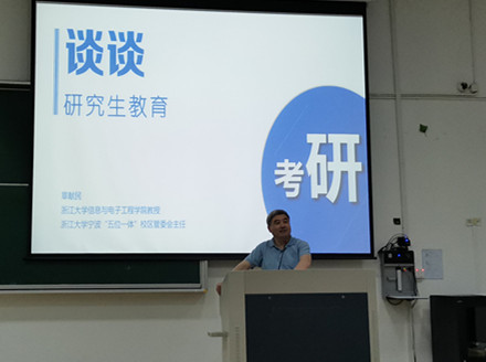 章献民副董事长从教授的角度,结合多年教学管理经验,与现场的师生们谈了研究生教育,他从研究生所必备的知识技能、沟通技巧、人格特性、工作习惯、动手能力等方面进行了分析,并对专业学位和学术学位做了比对和解读。此外,章副董事长向同学们介绍了浙江大学宁波五位一体校区的基本概况,重点介绍了校区研究生的招生及录取情况,鼓励现场的同学们踊跃报考校区研究生。