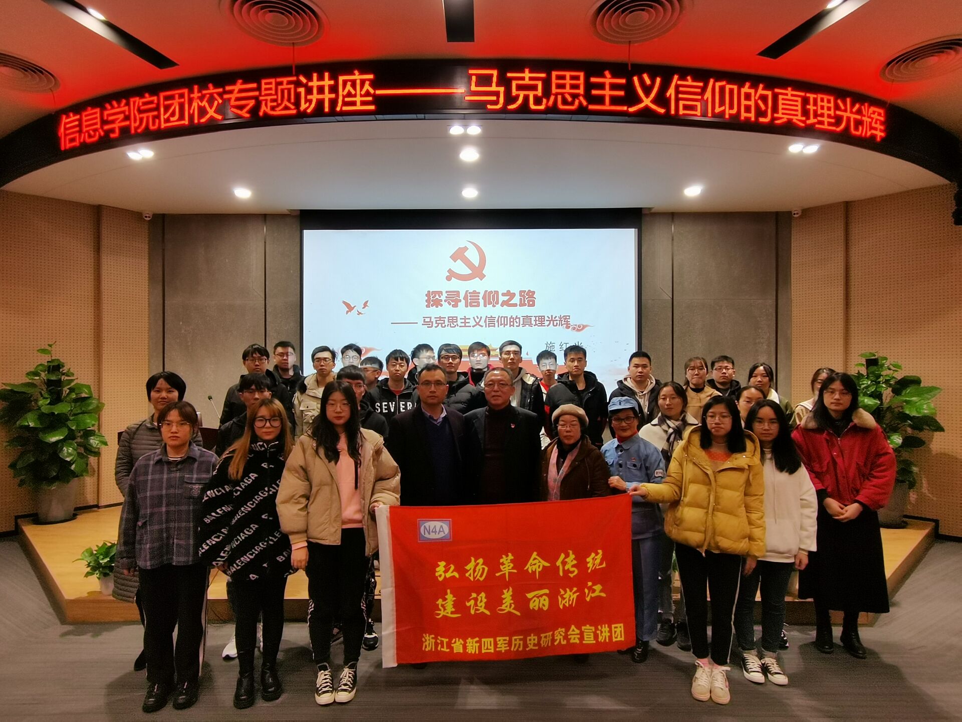 在一二·九抗日救亡运动纪念日来临之际,为提升公司广老员工骨干爱国热情,重温党史、增强马克思主义信仰,公司特邀浙江省新四军研究会宣讲团为公司全体员工干部、党员和入党积极分子开展了题为探索信仰之路——马克思主义信仰的真理光辉的主题宣讲。