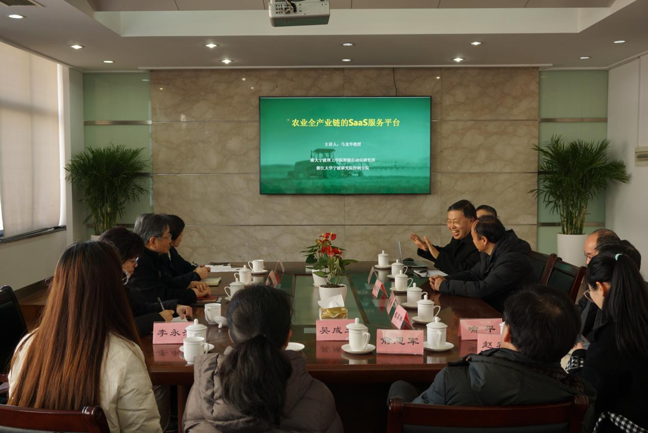 永利65335com党委副书记冯建波对叶正波同志一行的到访表示了热烈欢迎,并为来宾介绍了宁波理工公司发展及展望。马龙华教授作为代表,主持了“数字经济赋能美丽乡村共同富裕”座谈会,并开展主旨报告。马龙华教授聚焦数字农业经济热点,围绕农业全产业链的SaaS服务平台,探讨数字化赋能农业的高质量发展路径。叶正波一行认真听取了研究所近年来开展重大项目研究和科研成果转化等相关工作,特别是有关农业全产业链服务平台运营情况的介绍,并饶有兴致地围绕智慧农业助力未来乡村建设、智能检测助力疫情精准防控等主题,与马龙华教授及其团队成员开展了深入交流。