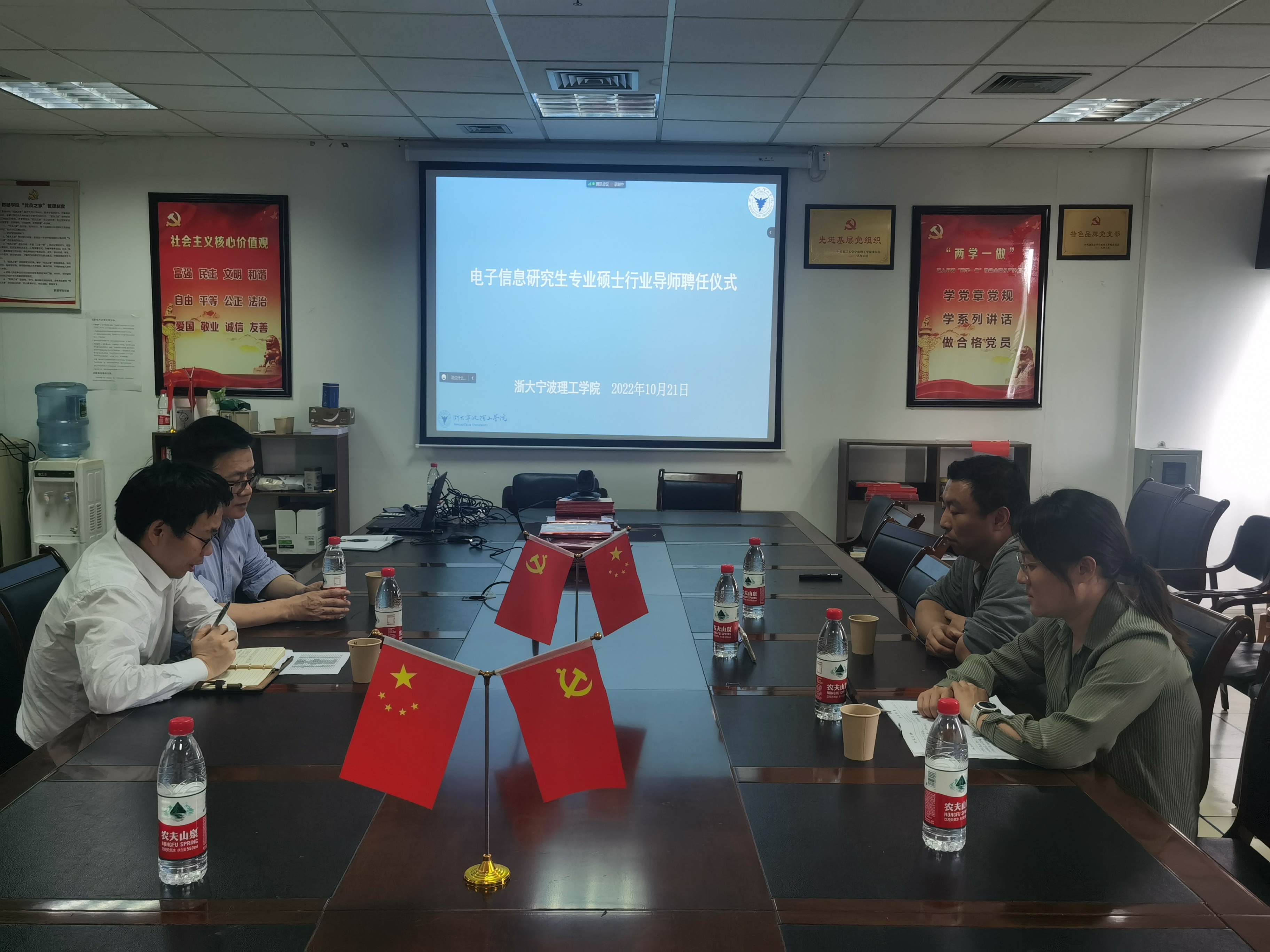 其次,由行业教师代表发言,宁波市信息中心董慧亚主任率先发言,她表示很高兴能够参与行业教师工作,希望把自己在政府工作中的经历传授给员工,做好行业教师工作。宁波工业互联网研究院何小其副教授随后发言,他表示很荣幸很高兴公司对他的信任提供这个互相交流的平台,他愿意将自己多年来积累的工作经验,跟员工作交流,持续做好传帮带的工作,关心支持电子信息硕士点的申报,共同携手,取长补短,高质量的完成研究生的培育任务。最后,陈根浪表示希望理工培养的研究生能上接地气,持续做好行业和应用的落地,持续产出更高水平的科研成果,未来的人才培养过程中离不开行业教师们的大力支持和帮助并再次表达了感谢。
