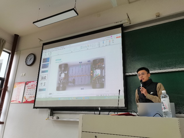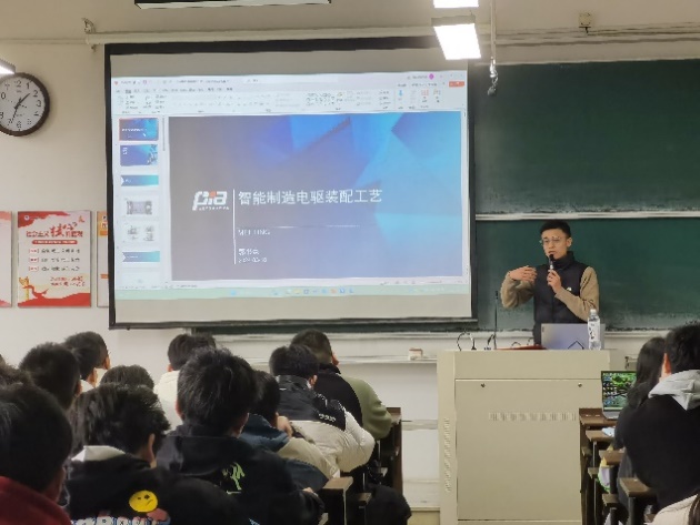 《电驱工艺》课程中,郭书豪首先介绍了均普智能和均胜集团,及其与自动化、电气专业的相关业务。随后,围绕电驱技术背景、产线、工艺三个主题,郭书豪对新能源汽车电驱系统生产流程做了详细的汇报。从新能源汽车电池、电机、电控“三电”系统的基础概念,到最新的双电机驱动方案;从电驱系统生产线所需的工序、工艺,到多种多样的执行机构,让到场师生对智能制造有了全新的认识,对《电机与运动控制系统》课程在自动化产线中的实践运用也有了更具体的了解。课后,郭书豪回答了现场师生关于工艺流程、工作心得的相关问题,鼓励同学们学好本科课程为将来工作打好基础。