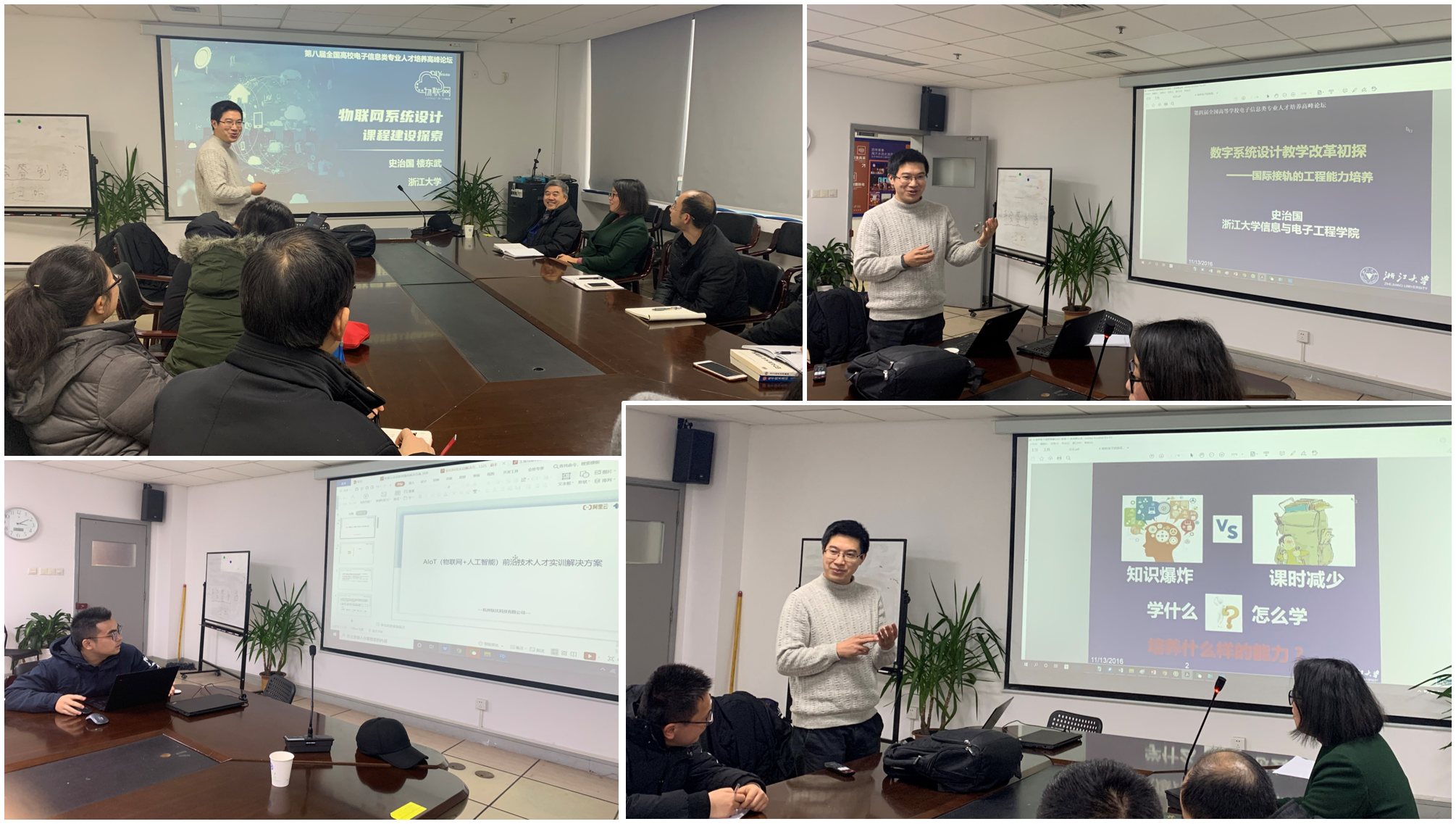 会上,史治国以《数字系统设计教学改革初探》、《物联网系统设计课程建设初探》为题,从课程内容、教学方法、教材选用编写、课程思政、实践环节设计实施、中国大学mooc建设运行等方面介绍两门课的课程建设工作,分享经验心得。接着,杭州钛比科技有限公司负责人作了《AioT(物联网+人工智能)前沿技术人才实训解决方案》的报告,为课程实践环节设计实施提供前沿技术方案。
