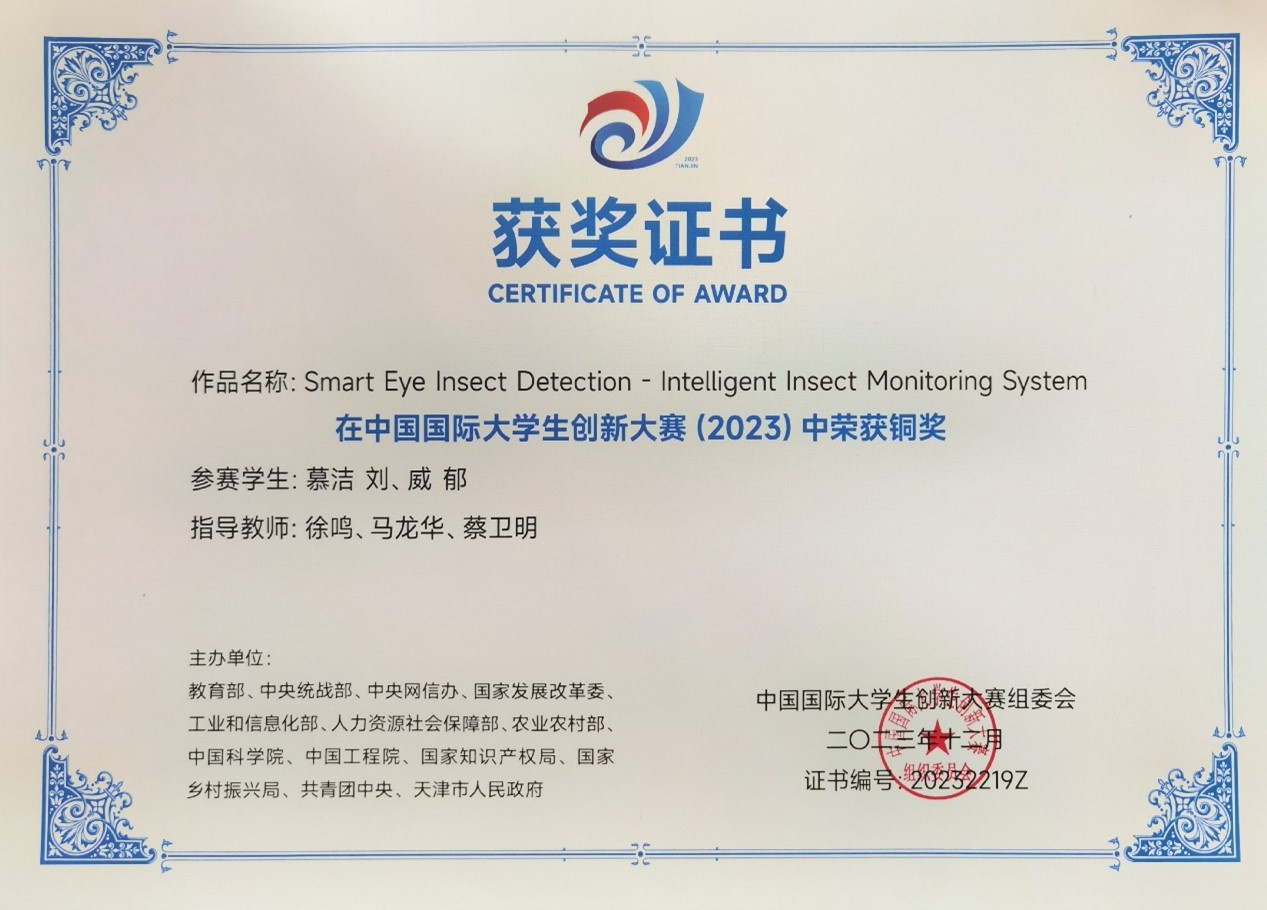 近日,教育部正式公布了中国国际老员工创新大赛(2023)获奖名单,永利65335com永利65335com徐鸣、马龙华、蔡卫明老师共同指导的创新项目《Smart Eye Insect Detection - Intelligent Insect Monitoring System》荣获铜奖。